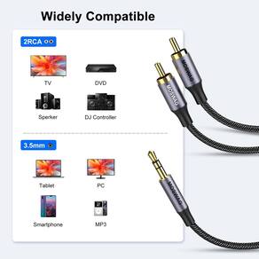 - ?Cabo 2RCA para 3,5 mm?O cabo estéreo de 3,5 mm para 2 RCA é ótimo para conectar dispositivos de áudio portáteis, como um smartphone, leitor de MP3 ou tablet a um estéreo, alto-falante, amplificador, TV, carro e outros dispositivos habilitados para RCA.