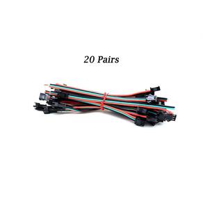 20 pares de conectores JST SM 22 AWG 3PIN de 150 mm/6" (20 machos e 20 fêmeas), cada um com 3 fios (preto, vermelho, verde).