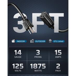 Compatível com computadores, impressoras, iluminação doméstica, luzes de pátio ao ar livre e eletrodomésticos, o cabo de extensão curto à prova de intempéries Dewenwils é seguro e confiável para uso interno e externo. O comprimento de 90 cm é perfeito para estender um cordão curto na tomada de parede atrás de móveis ou em uma área difícil de alcançar. - Cabo de extensão durável de alta qualidade – potência CA 125V/15A/1875W; construído com fio de cobre, lâminas reforçadas e cabos duplos revestidos pretos; possui design de moldagem total; suporta uma vida inteira de desgaste; certificado pela ETL - Fio à prova de intempéries 14/3C SJTW – Feito de fio SJTW atualizado de calibre 14/3 (à prova de intempéries); esta extensão de cabo de alimentação é adequada para temperaturas de -40 °C a 60 °C; jaqueta de PVC protege contra umidade, abrasão e luz solar direta. Observação: certifique-se de que as conexões não devem ser imersas na água - 91 cm para uso externo e interno – o cabo de alimentação de extensão de 9,5 cm funciona com aparelhos internos e externos; estenda o comprimento de um cabo de alimentação existente para tomadas de parede; perfeito para áreas difíceis de alcançar atrás dos móveis; plugue compacto não afetará o uso de outros plugues - Compatibilidade universal – O cabo de extensão de 3 pinos é compatível com lâmpadas, computadores, scanners, luzes de pátio e aparelhos domésticos que exigem um conector de alimentação de 3 pinos macho a fêmea; ideal para casa, escritório, cozinha, jardim externo; NEMA 5-15P para NEMA 5-15R - Pacote econômico com 2 – Material exclusivo de fio permanece flexível mesmo em clima frio; livre de emaranhados, fácil de enrolar e armazenar; 2 cabos de extensão são mais econômicos e práticos para estender o comprimento do cabo e carregar em sua viagem