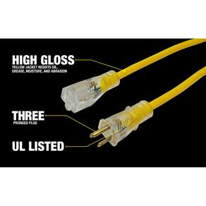 Este produto é compatível com tomadas que suportam 110 volts e pode exigir um conversor quando utilizado fora dos Estados Unidos. Jaqueta amarela 2884 12/3 Cabo de extensão SJTW pesado de 15 A com extremidades iluminadas, ideal para equipamentos e ferramentas pesados, plugues moldados transparentes duráveis, jaqueta amarela de alto brilho, 50 pés — pesado