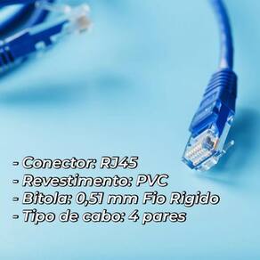 - Conector: RJ45 - Revestimento: PVC - Tipo: LAN/CFTV - Comprimento: 3m - Cor do cabo: azul -tipo de cabo de rede: 4 Pares -conector de entrada: RJ-45 -conector de saída: RJ-45 -impedância: 100 +/- 15Ohms -revestimento: PVC Retardante a Chamas CMX -aplicações: Todos os tipos de redes, suportando conexão gigabit -bitola: 0,51mm fio Rigido -frequência: 100Mhz -condutores: 8x0,51mm 4 Pares -composição: Alumínio Cobreado, Plastico PEAD, PVC - Certificação Anatel para componente, de acordo com os novos requisitos vigentes.