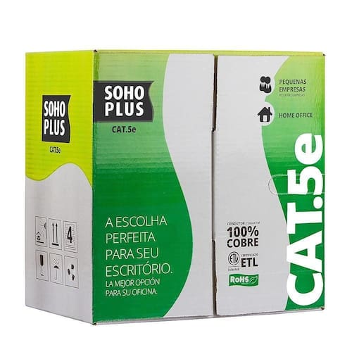 Cabo de pares trançados composto por condutores sólidos de cobre nu 24AWG Isolado em Polietileno especial não propagante À chama Atende aos requisitos da Norma ANSI/TIA/EIA 568B.2. Caixa com 305 mts de cabo. Cat 5e Cinza