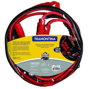 Cabo para Transmissão de Carga Tramontina tipo Jacaré 250 A 2,5 m O Cabo para Transmissão de Carga Tramontina 250 A 2,5 m é uma peça prática e versátil. As garras tipo jacaré tornam a fixação da bateria muito mais eficiente e os cabos em cores diferentes auxiliam para uma melhor visualização e segurança durante a operação. Cabos de cobre de 8 mm de diâmetro revestidos com PVC. Garras tipo jacaré em cobre com empunhaduras revestidas em PVC. Capacidade: 250 A. Comprimento: 2,5 m. Prático e versátil. Garras tipo jacaré para melhor fixação na bateria. Cabos em cores diferentes para melhor visualização e segurança durante a operação. As ferramentas são produzidas e testadas conforme requisitos internos de fabricação esegurança. Uso seguro e adequado: - Ambas as baterias devem ser da mesma tensão e polaridade, caso contrário consulte um eletricista automotivo para maiores informações. - Verifique o manual do veículo para encontrar a polaridade correta. - Freio de mão deve estar sempre acionado durante o procedimento. - Veículos não devem ser tocados durante o procedimento. - Desligue a ignição de ambos os veículos antes de iniciar a conexão. - As baterias dos veículos contêm ácidos e emitem gases inflamáveis. - Não fume ou use o equipamento perto de uma chama. - Não deixe ferramentas sobre a bateria. - Remova artigos metálicos e joias (correntes, anéis) das mãos, punhos e pescoço antes de começar a trabalhar com a bateria. - Conectando os cabos para bateria: Conecte a garra do cabo vermelho ao terminal positivo (+) da bateria descarregada. Conecte a outra garra do cabo vermelho no terminal positivo (+) da bateria carregada. Conecte a garra do cabo preto ao terminal negativo (-) da bateria carregada. Conecte a outra garra do cabo preto no terminal negativo (-) da bateria descarregada. Assegure-se que as ligações estão livres de partes móveis. De partida na ignição do carro com a bateria descarregada e deixe o mesmo ligado por pelo menos 1 minuto. - Desconectando os cabos para bateria: Desligue o motor do carro;