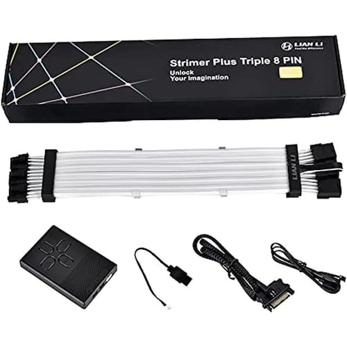 Cabo extensor lian li strimer plus v2 triple 8 pin rgb 8 pinos Cabo extensor lian li strimer plus v2 triple 8 pin, rgb, 8 pinos Cabos de extensão rgb endereçáveis altamente personalizáveis. Disponível para placa-mãe de 24 pinos, gpu dupla de 8 pinos e gpu tripla de 8 pinos. Crie uma aparência de pc exclusiva com excelente qualidade e material Compatível com l-connect 3 para personalizar efeitos de luz Estilo de iluminação suave Ilumine o strimer plus v2 com um design elegante, reduzindo a largura das faixas de iluminação para 2,1 mm. Projeto de alta qualidade O produto bem projetado que brilha com qualidade. Especificações técnicas: Marca: Lian li Modelo: Pw12-pv2 Dimensões: 345 mm l x 56,3 mm d x 8 mm a Material: Silicone/tpe Comprimento do cabo: 300mm Medidor: 18awg Número de leds: 162 Acessórios: Adaptador de cabo para placa-mãe argb de 3 pinos
