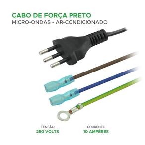 - Tipo: Cabo de Alimentação - Corrente Elétrica: 10A - Voltagem: 250V - Comprimento: 1,45 metro - Aplicação universal: Micro-ondas e ar-condicionados - Funções: Fornecimento de energia elétrica, estabilização de corrente Marca: Não Informado Ean: 7899744061407