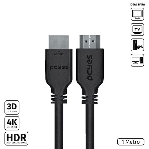 Descrição: Este cabo é indicado para dispositivos que possuam conexão HDMI tais como: TVs, monitores, Aparelhos Blu-ray, video-games, placas de vídeo, notebooks etc Dados Técnicos: Tamanho do cabo: 1M Material do cabo: cobre puro 30 AWG Largura de banda máxima: 18Gbit/s Resolução máxima: 4K (60Hz) Máximo de canais de áudio LCPM: 32 Taxa de áudio: 1536 kHz HDR Estático Suporta 3D Possui conexão Ethernet Conector HDMI macho/macho