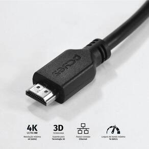 Dados Técnicos: Tamanho do cabo: 2M Material do cabo: cobre puro 30 AWG Largura de banda máxima: 18Gbit/s Resolução máxima: 4K (60Hz) Máximo de canais de áudio LCPM: 32 Taxa de áudio: 1536 kHz HDR Estático Suporta 3D Possui conexão Ethernet Conector HDMI macho/macho