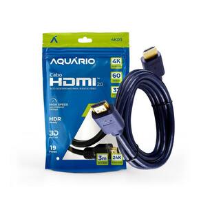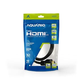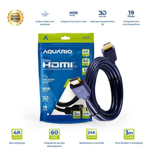 Cabo HDMI Aquário 2.0 4k Full HD 3D Blindado 4K03 - 3 metros Cabo HDMI Aquário 2.0 4k Full HD 3D Blindado 4K03 - 3 metros Com alta taxa de FPS, o Cabo HDMI da Aquário conta com tecnologia para garantir a melhor experiência e desempenho para áudio e vídeo e três metros para facilitar a instalação. Velocidade e alto desempenhoO Cabo HDMI 2.0 da Aquário possui alta performance e acabamento superior para garantir a melhor resolução e qualidade de som e imagem. Com conectores banhados a ouro 24K, ele é compatível com diversos tipos de aparelhos eletrônicos, como TVs, projetores, computadores, notebooks e consoles de games. Ele possui condutores livres de oxigênio para reduzir a perda de sinal e alta blindagem para evitar qualquer tipo de interferência. Outro destaque é que o cabo é revestido em PVC e compatível com proporção de cinema 21:9, com som imersivo com até 32 canais de áudio. Código 4K03Tamanho do cabo 3 metrosVersão 2.0Canal de retorno de áudio ARCResolução 4K 4096x2160p x 2K 2048x1080p Conectores banhados a ouroFácil de instalar