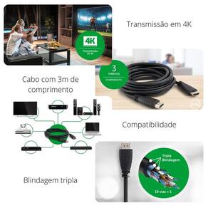 suporte a resolução 4k / 60hz largura de banda de 18 gbps compatível com tvs lcd, led, oled, qled, plasma, videogames, notebooks e projetores. permite o uso de funções inerentes a tecnologia hdmi, tais como cec e arc. conectores banhados a ouro suporte a ethernet cabo com comprimento de 3m blindagem tripla para maior proteção contra interferências externas versão 2.0