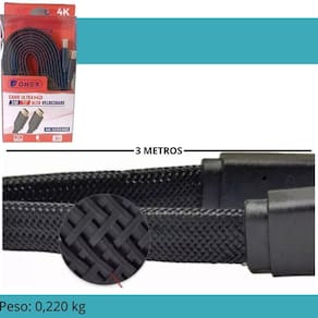 Descrição do anúncio: Cabo chato malha hdmi full hd 3 metros Conteúdo da embalagem: 1 cabo chato malha hdmi full hd de 3 metros Características: Comprimento: 3 metros Acabamento: chato com malha pvc Peso: 0,220 kg Conectores banhados a ouro para melhor qualidade de som Ideal para transferência de áudios e vídeos em alta definição Especificações: Comprimento do cabo: 3 metros Acabamento: chato com malha pvc Peso: 0,220 kg Conectores: banhados a ouro Compatibilidade Televisão digital 4k Tv / monitor de plasma, lcd, led e led 3d Conversor de sinal Dvd/dvdrw a/v Caixa satélite Monitor de alta definição D-vhs player Blu-ray Principais perguntas sobre o produto e respostas: 1 o cabo é compatível com televisões 4k Sim, o cabo é compatível com televisão digital 4k, garantindo a máxima qualidade de imagem e som. 2 qual é o comprimento do cabo O cabo possui 3 metros de comprimento, ideal para conexões em diferentes ambientes. 3 os conectores são banhados a ouro Sim, os conectores são banhados a ouro, o que garante uma maior confiabilidade e qualidade de som, eliminando ruídos e perdas de sinal. Homologação Anatel: 149822010251