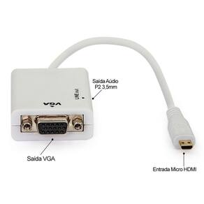 Cabo Micro Hdmi - Vga Com Áudio - Branco O Adaptador Micro HDMI para VGA Com Áudio permite ligar equipamentos com sinal digital: celulares modelos mais antigos e outros dispositivos com interface Micro HDMI a equipamentos com padrão analógico: projetor, monitor, TV e outros dispositivos que utilizam entrada VGA. Curta o melhor da tecnologia com os produtos da Cirilo Cabos Entrada: Micro HDMI Macho Saída Vídeo: VGA Fêmea Saída áudio: P2 de 3,5 mm Resolução: 720p/ 1080i / 1080p Cor: Branco Conteúdo da embalagem: 01 Adaptador Micro HDMI para VGA Com Áudio