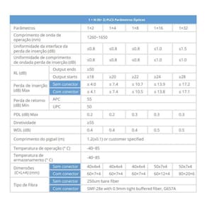 Informações do Produto O splitter EVUS PLC (Planar Lightwave Circuit) ou divisor de fibra óptica, baseia-se num substrato de quartzo que serve como guia de ondas , atuando como um dispositivo de distribuição de energia. Seu funcionamento é similar aos divisores utilizados em sistemas de transmissão de cabo coaxial. É um dos mais importantes dispositivos em ligação de fibras ópticas, utilizado especialmente em redes ópticas passivas (EPON, GPON, BPON, FTTx, FTTH, etc) para ramificar o sinal óptico. Características: Baixa perda de inserção Uniformidade excelente Tamanho compacto Confiabilidade elevada Aplicações: FTTH/FTTX Redes óticas passivas Sensores fibrópticos Redes de área local Instrumentos de teste