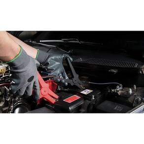 - Conecte a outra garra do cabo vermelho no terminal positivo (+) da bateria carregada.