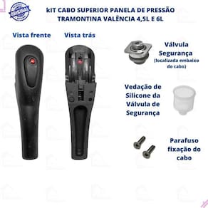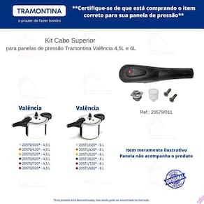 Nosso empenho é procurar o que há de mais atual e funcional no mundo culinário e para organização da sua casa, priorizando sempre a qualidade e a versatilidade dos produtos. Cabo superior para panela tramontina valência 4,5l e 6l Cabo superior da panela tramontina valência, o cabo é antitérmico que garante ainda mais segurança durante o uso, pois reduzem a propagação do calor. Atenção: não acompanha cabo inferior, alças, válvula de segurança e pino. Somente o cabo superior. Referencia: 20579/011 Serve nos modelos: Valência 4,5l valência 6l 20570/020 20571/020 20570/420 20571/420 20570/520 20571/520 20570/620 20571/620 20570/720 20571/720 20570/920 20571/920 Não serve nos demais modelos. conteúdo da embalagem: 1 cabo superior 1 válvula segurança para o cabo 1 vedação de silicone para a válvula 2 parafusos Gostou Esse produto pode ser seu aguardamos sua compra Marca: Não Informado