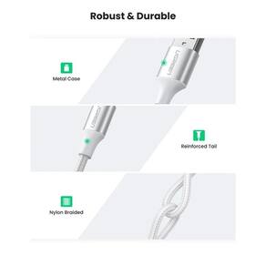 O Cabo UGREEN USB-A/USB-C 3A US288 (1m) oferece carregamento rápido de 3A, transferência de dados até 480Mbps, com resistência e durabilidade graças ao cabo trançado de nylon e blindagem interna múltipla.