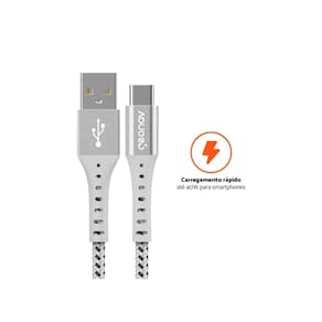 Cabo USB-A para USB-C em Nylon Trançado, suporta carregamento rápido de até 40W e 2A, com revestimento reforçado em nylon para maior durabilidade e resistência contra dobras. Comprimento de 1,20m.Tipo