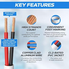 - Instalação facilitada: esses fios de alto-falante apresentam nossos condutores CCA (alumínio revestido de cobre) leves e flexíveis envoltos em uma capa de proteção branca isolante e flexível com classificação Cl2 para facilitar a manobrabilidade. Além disso, o cabo em massa vem em nossa caixa Easy Pull padrão com marcações sequenciais a cada dois pés para que você saiba exatamente quanto fio resta.