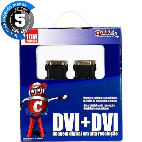 Cabos Dvi Para Dvi, 10 Mt Cirilo Cabos - Kit 5 O Cabo DVI-D para DVI-D 25 pinos Dual Link de 10 metros da Cirilo Cabos possui pontas banhadas em ouro que proporciona uma excelente imagem em HD digital com resolução de até 2560 x 1600 a 60 quadros por segundos. Ideal para conectar a placa de vídeo DVI em Monitores LCD, TVs LCD ou Projetores digitais. - Desenvolvido pela Cirilo Cabos com a melhor tecnologia em DVI - Imagem em alta resolução Digital HD - Pontas Banhadas em Ouro - DVD-D 25 Pinos Dual Link - Resistente Leve mais e pague menos com os Kits da Cirilo Cabos Especificações Técnicas: Conectores: - DVI-D para DVI-D - Macho - 25 Pinos - Parafusos laterais para melhor fixação Resolução: Até 2560x1600 a 60fps Pontas: Banhadas em Ouro Comprimento do cabo: 10 metros Cor: Preto Acompanha: 05 - Cabo DVI para DVI Macho Cirilo Cabos 25 Pinos Dual Link - 10 metros Peso Individual: 600g Peso do kit: 3 kg Garantia: 3 meses Atenção: Cabo DVI para DVI não transmite áudio. Verifique a compatibilidade com seu equipamento antes da compra, não nos responsabilizamos por incompatibilidades.