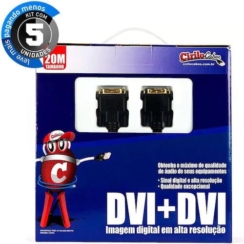 Cabos Dvi Para Dvi, 20 Metros Cirilo Cabos - Kit Com 5 Deseja ligar seu aparelho DVI com imagem em HD Esse Cabo DVI-D para DVI-D de 20 metros da Cirilo Cabos é a solução ideal, ele oferece pontas banhadas em ouro e 25 pinos, tudo isso para proporcionar a melhor imagem em HD digital. O modelo DVD-D Dual Link é compatível com resoluções de até 2560 x 1600 a 60 quadros por segundos.