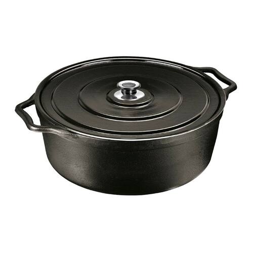 Caçarola Artesanal Tampa Metálica Panela Mineira 50cm 26L A Caçarola Artesanal Alça de Ferro e Tampa Metálica da Panela Mineira possui um design aperfeiçoado, fundo reto preto, bordas alongadas e tampa moderna. Sua excelente distribuição e retenção de calor, característico do ferro fundido, a torna ideal para assar, grelhar, fritar e cozinhar de maneira lenta e com muita maciez, sendo muito utilizada no preparo de arroz, feijão, carnes, legumes, caldos, ensopados e mais. A Tampa Metálica leve facilita o dia a dia na cozinha, pois não absorve odores e não deixa resíduos. Onde Usar: Pode ser utilizado em fogões a gás, a lenha, elétricos, cooktops de indução, vitro-cerâmicos, fornos, grills, churrasqueiras e fogo de chão. Não aconselhamos a usar a tampa no forno, devido ao batoque ter partes em polipropileno. Orientação de Uso e Conservação:Antes do primeiro uso: Lave com água e sabão, seque bem com um pano e leve ao fogo para remover toda a umidade. Já vem pronta para uso, então não precisa ser curada. Guarde em um local seco. Após cada uso: Lave com água e sabão, usando uma esponja ou escova para remover todos os resíduos de alimentos. Se restarem resíduos, ferva água com um pouco de detergente para soltá-los. Pintura: Revestimento atóxico que garante durabilidade e proteção prolongada, sem causar nenhum dano à saúde. Características Técnicas e Medidas:Altura Com Tampa: 24cm.Altura Sem Tampa: 18cm.Material: Ferro Fundido.Modelo: Redondo.Diâmetro: 50cm.Linha: Artesanal.Litragem: 26L.Peso: 23,2Kg.Tampa: Aço.Alças: Ferro. Itens Inclusos:01 Caçarola Artesanal Panela Mineira 50cm 26L.01 Tampa Metálica em Aço 50cm.01 Batoque em Platinela. Código: 241PMProdutoLojaPlast.