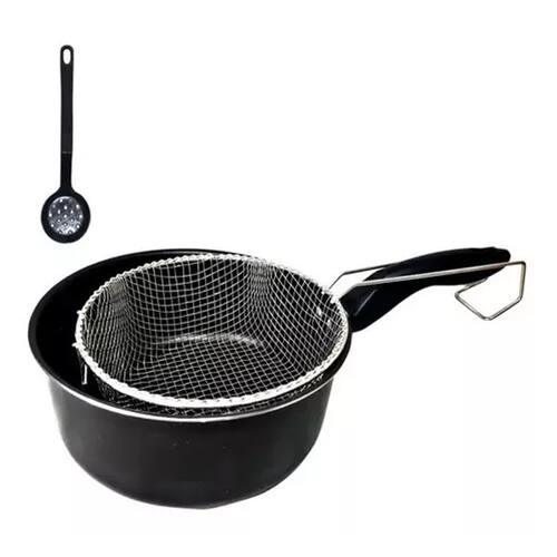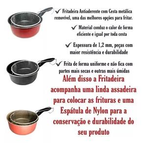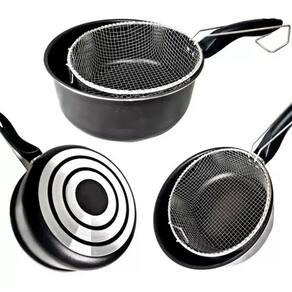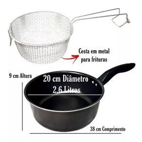 Prazer, somos a Mandacaru & Varejo Nossa missão é garantir a satisfação total dos nossos clientes, entregando produtos de qualidade e excelência no atendimento.Assim estabelecendo uma relação de confiança, oferecendo a você, a melhor experiência de compra!Para garantir sua melhor experiência, recomendamos que leia completamente a oferta e as descrições do produto pretendido, e caso tenha alguma dúvida utilize o campo de perguntas para que nossa equipe possa lhe auxiliar. Nossa equipe de pós venda está à disposição para te auxiliar e esclarecer eventuais dúvidas.Agradecemos a sua visita e aguardamos seu pedido! Caçarola Fritadeira Antiaderente com Cesta Removível, uma das melhores opções para Fritar de tudo! Isso porque este material conduz o calor de forma eficiente e igual por toda a forma, o que faz com que a fritura fique uniforme e não fique com partes mais secas e outras mais úmidas. Produzida com alumínio antiaderente de alta qualidade, espessura de 1,2 mm, peças com maior resistência e durabilidade, alumínio que distribui melhor o calor, proporcionando um cozimento mais rápido e uniforme do alimento. Além disso o conjunto acompanha uma linda Espátula de Nylon para a conservação do produto, que não passa o calor, contribuindo para um manuseio mais confortável e seguro.Especificações Técnicas:Dimensões aproximadas - cm: (A x L x C):- 1 Fritadeira com Cesta 20cm diâmetro – 9 x 21 x 38 (2,6 Litros)- 1 Espátula Nylon Material Fritadeira: Alumínio Antiaderente TeflonMateria Espátula: NylonEspessura Material: 1,2 mmPeso: 230 gPeso Embalagem: 170 gEmbalagem: Saco Plástico / Caixa PardaDimensões aproximadas da embalagem (AxLxP): 7 x 25 x 28 cmCuidados:- Ideal para fogão a gás, elétrico e vitrocerâmico com resistência elétrica;- Para mexer os alimentos use somente utensílios de silicone ou nylon;- Nunca use utensílios de metal ou objetos pontiagudos;- Mantenha o produto sobre o fogão ou fonte de calor, apenas o necessário para o cozimento, sempre em fogo baixo ou médio (nunca superior a 350°C);;- Não pode ser levada ao microondas;- Evite a imersão do produto quente em água fria. Sempre o deixe esfriar antes de lavar;- Para limpeza, utilize sabão ou detergente neutro e esponja macia;- Nunca utilize solventes, objetos cortantes ou abrasivos;- Para maior durabilidade do produto recomenda-se secar bem antes de guardar.Informações do Fabricante: A Coisas&Trecos possui 18 anos de experiência no mercado de alumínio, entregando produtos com qualidade aos clientes. Garantia do fornecedor: 30 dias contra defeitos de fabricação.Estamos à disposição para qualquer dúvida.