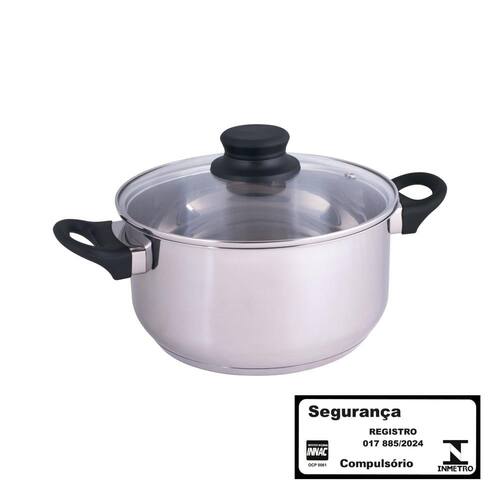 A Caçarola Inox 21 cm garante o preparo de deliciosos pratos. Ideal para ensopados, molhos, refogados, risotos, purês e cremes, dentre outros, ela combina funcionalidade, durabilidade e elegância.Com capacidade de 3,2 litros, possui cinco camadas, para melhor distribuição do calor: aço inoxidável, alumínio, ferro, alumínio e aço inoxidável. Já a tampa é em vidro temperado, o que permite a visualização do preparo.Com alças e pomel antideslizantes, em baquelite, também tem um reforço contra acidentes, já que o material retém o calor. Além disso, é fácil de limpar e pode ser colocada na lava-louças. Compatível com fogões a gás, elétrico e por indução.