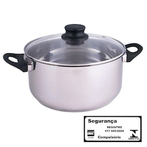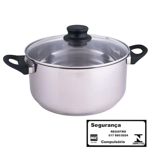 A Caçarola Inox 25 cm garante o preparo de deliciosos pratos. Ideal para ensopados, molhos, refogados, risotos, purês e cremes, dentre outros, ela combina funcionalidade, durabilidade e elegância.Com capacidade de 5,3 litros, possui cinco camadas, para melhor distribuição do calor: aço inoxidável, alumínio, ferro, alumínio e aço inoxidável. Já a tampa é em vidro temperado, o que permite a visualização do preparo.Com alças e pomel antideslizantes, em baquelite, também tem um reforço contra acidentes, já que o material retém o calor. Além disso, é fácil de limpar e pode ser colocada na lava-louças. Compatível com fogões a gás, elétrico e por indução.