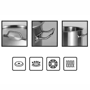 - Material: Aço inox de alta qualidade resistente, durável e fácil de limpar; - Funciona em todos os tipos de fogão, incluindo indução, graças ao fundo triplo magnético; - Possui fundo triplo (aço inox + alumínio + aço inox), tecnologia que distribui melhor o calor, cozinhando os alimentos mais rapidamente e com menos gasto de energia.