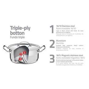 Economiza tempo e energia: o segredo está no fundo triplo (aço inox + alumínio + aço inox), que distribui o calor uniformemente, proporcionando um cozimento mais rápido. Por isso, você pode manter o fogo baixo durante todo o preparo e, assim, poupar energia. Além disso, a panela toda em aço inox pode ir ao forno para gratinar ou finalizar pratos, na temperatura máxima de 260C.