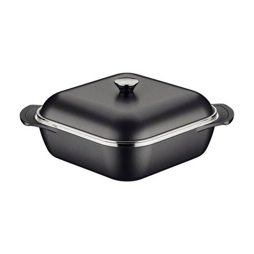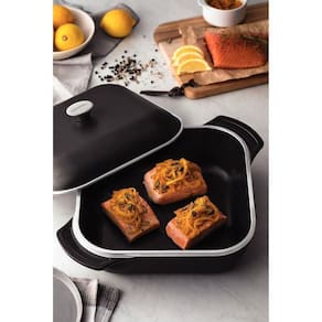 Corpo de alumínio forjado com espessura de 8,0 mm que proporciona cozimento rápido e uniforme. Tampa de alumínio com espessura de 4,5 mm que proporciona cozimento rápido e uniforme. Revestimento interno e externo de antiaderente Starflon High Performance que não gruda, é fácil de limpar, mais durável, não é prejudicial à saúde e é livre de PFOA.Alças em alumínio forjado e pegador de aço inox. É possível assar, cozinhar, fritar, descongelar e até leva-las ao forno sem a tampa para gratinar. Pode ir à máquina de lavar louças, porém, para maior durabilidade do produto, indicamos lavar manualmente.