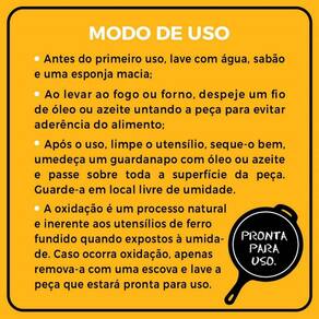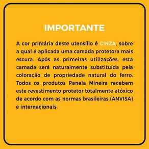 Sinônimo de tradição e tecnologia desenvolvida com exclusividade pela empresa a quase 50 anos de de experiência, oferecendo produtos de durabilidade superior, charme e exclusividade, que vão do fogão à mesa com muita personalidade. Suas panelas e caçarolas apresentam a espessura nas laterais e no fundo ideais para um cozimento uniforme. A perfeita distribuição do calor e cocção prolongada enaltece o sabor e aroma dos alimentos. A excelente transmissão e retenção de calor do ferro fundido garantem um bom cozimento sem que o alimento perca seus líquidos e propriedades nutritivas. Ao contrário, as receitas são levemente enriquecidas com a transferência do ferro para os alimentos, suprindo 20% das necessidades diárias deste mineral no organismo e ajudando a prevenir ou curar anemias. História, design, saúde e qualidade são atributos da Panela Mineira.O revestimento utilizado em todos os utensílios de cozinha são a base d’água e totalmente atóxicos, sendo certificados pela Anvisa e atendendo também às normas internacionais sobre o contato do revestimento com o alimento, não causando nenhum mal à saúde. Além disso, o cozimento de alimentos nesse tipo de panela chega a suprir cerca de 20% das necessidades diárias de ferro do organismo, ajudando a prevenir e até mesmo curar anemias, conforme estudos comprovados pela ciência. Alguns produtos apresentam design inteligente, como as Chapas com uma face lisa e a outra estriada. As chapas Dupla Face podem ainda serem redondas ou retangulares, de modo a trazer toda a versatilidade para suas receitas ficarem ainda mais saborosas.Além disso, há um sistema de gotejamento onde as tampas de ferro para panelas e caçarolas possuem, na superfície interna, um sistema de gotejamento da água condensada, que diminui a perda de calor e aumenta a eficiência no cozimento.O fundo uniforme para fogão Cooktop permite o uso nas cozinhas mais modernas às frigideiras e caçarolas da Fumil tem um fundo externo liso, oferecendo excelente cozimento em fogões elétricos “Cooktop”.Quando você escolhe uma chapa, chaleira, panela, caçarola ou réchaud da Fumil com alça espiral, você tem um produto único no mundo. A alça de aço inoxidável é uma tecnologia exclusiva da Panela Mineira, assim como as panelas, resistem às altas temperaturas, impactos, desgastes do tempo e uso, seu formato em espiral diminui a propagação do calor e não queima suas mãos, mesmo quando a panela está ao fogo.Modo de Uso.Antes do primeiro uso, lave com água, sabão e uma esponja macia;Ao levar ao fogo ou forno, despeje um fio de óleo ou azeite untando a peça para evitar aderência do alimento;Após o uso, limpe o utensílio, seque-o bem, umedeça um guardanapo com óleo ou azeite e passe sobre toda a superfície da peça. Guarde-a em local livre de umidade.A oxidação e um processo natural e inerente aos utensílios de ferro fundido quando expostos á umidade. Caso ocorra oxidação, apenas remova-a com escova e lave a peça que estará pronta para uso.Importante.A cor primaria deste utensílio e cinza, sobre a qual é aplicada uma camada protetora mais escura. Após as primeiras utilizações, esta camada será naturalmente substituída pela coloração de propriedade natural do ferro. Todos os produtos Panela Mineira recebem este revestimento protetor totalmente atóxico de acordo com as normas brasileiras (ANVISA) e internacionais.