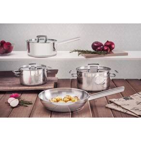 A sua cozinha pode ficar extremamente moderna e elegante com a Caçarola Tramontina Funda em Aço Inox Fundo Triplo com Tampa Plana e Alças 16 cm de diâmetro 1,8 L. A linha Brava une todos os traços modernos com a elegância do clássico aço inox. A caçarola da Tramontina é ideal para quem busca preparar receitas de um jeito único, conversando o sabor dos ingredientes, além de poder contar com uma panela que traga todas as funcionalidades que um bom cozinheiro deseja. O seu fundo triplo (aço inox + alumínio + aço inox) torna o cozimento ainda mais rápido, pois a distribuição de calor é feita de forma uniforme e o seu fundo de inox não solta resíduos, mantendo os alimentos saudáveis. Mais saudável: por ser feita de aço inoxidável, a caçarola Tramontina não libera nenhum tipo de resíduo nas suas receitas. Fácil de usar: uma caçarola prática para todas as suas receitas e que faz bonito em qualquer tipo de fogão: gás, elétrico, vitrocerâmico e indução. Ainda possui tampa com saída de vapor e encaixe perfeito. Mais durável: o inox Tramontina é uma matéria-prima nobre, resistente e que vai fazer bonito por muito mais tempo na cozinha. Economiza tempo e energia: o segredo está no fundo triplo (aço inox + alumínio + aço inox), que distribui o calor uniformemente, proporcionando um cozimento mais rápido. Por isso, você pode manter o fogo baixo durante todo o preparo e, assim, poupar energia. Além disso, a caçarola toda em aço inox pode ir ao forno para gratinar ou finalizar pratos, na temperatura máxima de 260°C. Fácil de limpar: deixar sua caçarola brilhando é simples, você só precisa de água, sabão e uma esponja macia. Se preferir, é só colocar na máquina de lavar. Observações A capacidade volumétrica máxima para cozimento é de 3/4 da capacidade total da peça.Antes de utilizar o produto, remover as eventuais etiquetas e lavar com água quente e detergente. Use uma fonte de calor brando para evitar que o alimento grude no fundo da caçarola. O fundo triplo distribui uniformemente o calor, não sendo necessário o fogo alto. E, além disso, você economiza energia. Quando a caçarola for utilizada no fogão a gás, a chama não deve ultrapassar a base da caçarola. No caso de uso de chapa elétrica, a chapa deverá ter diâmetro igual ou inferior ao da caçarola. Sempre dissolva o sal em água fervendo ou com os alimentos, mexendo os ingredientes no início do cozimento. Não aqueça o alimento colocando uma caçarola do mesmo diâmetro sobre a outra. Esse procedimento é perigoso, pois cria vácuo e impossibilita a retirada do mesma. Se a tampa da caçarola de aço inox Tramontina ficar presa pelo efeito do vácuo durante o resfriamento, basta puxar ou aquecer novamente até neutralizar o efeito do vácuo. As alças de inox aquecem durante o cozimento. Aconselhamos o uso de luvas durante o manuseio. Alguns alimentos que possuem amido, como massa e arroz, poderão deixar manchas na parte interna da caçarola durante o cozimento. Para remover facilmente as manchas, passe um pano umedecido com suco de limão ou vinagre, ou use a Pasta para Polir e Remover Manchas Tramontina. Evite deixar alimento na caçarola por muito tempo; o sal também pode provocar manchas. Para que a caçarola de aço inox fique sempre bonita e com brilho, recomendamos que seja lavada somente com detergente e esponja. A Tramontina desenvolveu uma pasta especial para polir e remover manchas nos produtos de aço inoxidável, que está disponível nos principais pontos de venda. Depois da lavagem, sempre que possível, enxágue a caçarola com água quente e seque-a imediatamente, para que ela mantenha o brilho original, pois o cloro e as substâncias contidas na água podem deixar manchas na caçarola. Pode ir ao forno em temperatura máxima de 260°C, podendo haver mudança na coloração. Não deixe a caçarola vazia sobre uma fonte de calor. Deixe caçarolas quentes somente em superfícies resistentes ao calor. Características Gerais EAN13 7891116138427 DUN14 17891116138424 NCM 7323.93.00 Peso Líquido 0,6900 kg. Peso Bruto 0,8060 kg. Metragem 0,004223 m³. Dimensões Embalagem (Compr. X Larg. X Alt.) 230x 170x 108 mm. Dimensões Produto (Compr. X Larg. X Alt.) 233x 170x 121 mm. Diâmetro 16,0 cm. Capacidade 1,80 l. Espessura 0,5 mm.