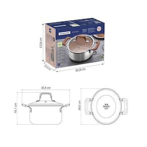 Modo de uso: O uso prolongado em temperaturas altas pode causar o amarelamento da superfície em aço inox. Para que a panela de aço inox fique sempre bonita e com brilho, recomendamos que seja lavada somente com detergente neutro e esponja. Nas partes foscas da panela pode-se utilizar o lado mais abrasivo da esponja com saponáceo líquido, para remover as manchas mais difíceis, ou ainda, pode ser usada a pasta para polimento e remoção de manchas da Tramontina. Depois da lavagem, enxágue a panela com água quente e seque-a imediatamente, para que ela mantenha o brilho , pois o cloro e as substâncias contidas na água podem deixar manchas na panela.