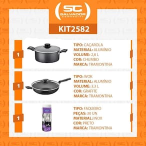 MUITO IMPORTANTE:CONFERIR PRODUTOS NO ATO DO RECEBIMENTO. NÃO ACEITAR PRODUTOS COM EMBALAGEM VIOLADA (AMASSADO, RASGADO, ABERTO, QUEBRADO, ETC), A RECUSA DEVE SER FEITA NO ATO Componentes do Kit:1 - Caçarola Turim Alumínio Antiaderente Chumbo 20cm 2,8l Ptc2 - Tramontina1 - Faqueiro Inox 30pc Ipanema Preto - Tramontina1 - Wok Com Cabo Loreto Alumínio Revestimento Antiaderente 28 cm 3,3 l Grafite - Tramontina Caçarola Turim Alumínio Antiaderente 2,8L + Faqueiro Ipanema 30pc + Wok Loreto 3,6L - Tramontina Aprimore sua experiência gastronômica com o Kit Completo Tramontina, a escolha perfeita para quem busca versatilidade no preparo e elegância na mesa. Este conjunto é ideal para cozinheiros domésticos, pois eleva o padrão de suas refeições, tornando o processo mais rápido e agradável. A Caçarola Turim e a Wok Loreto são perfeitas para pratos variados, do ensopado ao salteado, enquanto o Faqueiro Ipanema adiciona um toque de charme. O revestimento antiaderente em todas as panelas garante que os alimentos não grudem, um benefício crucial para cozinhar de forma mais saudável e com menos óleo. A Wok Loreto com seu fundo mais espesso permite um aquecimento uniforme e rápido, otimizando o tempo de cozimento. A Caçarola Turim e a Wok, ambas com revestimento antiaderente Starflon T1, proporcionam uma limpeza incrivelmente fácil, enquanto o Faqueiro Ipanema com lâminas de aço inox oferece resistência e um manuseio confortável. Todo o kit é construído com materiais de alta qualidade, oferecendo a durabilidade e a resistência necessárias para o uso diário. O design inteligente das peças, que otimiza o uso do espaço, torna sua cozinha mais organizada. Não perca a oportunidade de ter mais eficiência e beleza em sua casa. Adquira agora o Kit Tramontina e desfrute do prazer de cozinhar e servir com excelência! Especificações Caçarola:- Capacidade: 2,8L;- Alumínio com 1,2mm de espessura;- Revestimento anti-aderente;- Altura com tampa: 13,5cm;- Altura sem tampa: 9cm;- Altura interna: 8,7cm;- Diâmetro: 20cm;- Comprimento total: 32,5cm;- Garantia de 90 dias para vícios ou defeitos de fabricação;- Não utilizar em temperaturas superiores à 260C Especificações Faqueiro:- Antes da primeira utilização, lave bem as peças e seque-as.- Produto cortants e perfurantes, tenha cuidado e mantenha sempre fora de alcance das crianças.- Para maior durabilidade dos produtos, recomenda-se secar bem antes de gaurar, mesmo após lavagem em máquinas.- Para descarte dos produtos e embalagem, sega as orientações de reciclagem vigente. Conteudo:6 Faca Lâmina 11,2cm - medida 21cm6 Garfos de mesa. - medida 19cm6 Colheres de mesa. - medida 19cm6 Garfos para sobremesa. - medida 14cm6 Colheres para chá. - medida 14cm Especificações Wok:- Corpo de alumínio com espessura de 1,8 mm que proporciona cozimento rápido e uniforme.- Revestimento interno e externo de antiaderente Starflon Max.- Tampa de vidro temperado com borda de aço inox e saída de vapor.- Cabo e alça de baquelite antitérmico e pegador de nylon que oferecem segurança durante o manuseio.- Pode ir à máquina de lavar louças facilitando seu dia a dia.- Medida do Produto: 13,2cm A x 51,8cm L x 28,4cm P Cor: Cinza | É kit de fábrica: Não | Quantidade de Peças: 32 | Materiais: Alumínio | Adequado para fogão de indução: Não | Com revestimento antiaderente: Sim
