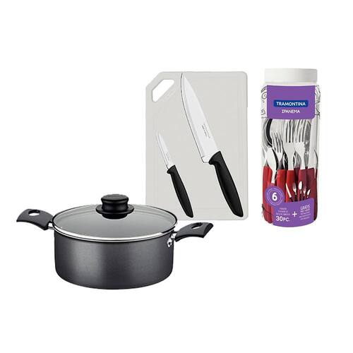 Caçarola Turim Alumínio grafite Antiaderente 2,0l + Faqueiro Ipanema 30pc + Tábua e Facas - Tramontina