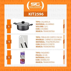 Crie seu nível na cozinha com o Kit Completo Tramontina, a solução ideal para quem busca eficiência e excelência. Perfeito para cozinheiros amadores e experientes, este conjunto de itens melhora sua experiência culinária. A caçarola com revestimento antiaderente garante um cozimento perfeito e uniforme, essencial para uma limpeza fácil e rápida.