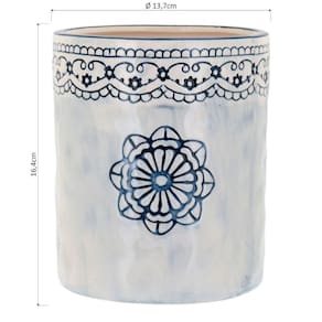 Cachepô 16x13x13cm Cerâmica Azul Esse cachepô é produzido com cerâmica de qualidade e possui um alto relevo liso e ondulado com um floral em alto relevo no centro e na borda superior. Ele é lindo e charmoso, ideal para decorar diversos ambientes internos e externos. Nele pode ser cultivada as suas plantas favoritas.