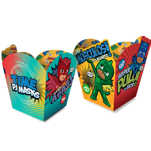 Cachepot PJ Masks C/4 Regina. Conte com esses pequenos e adoráveis super-heróis noturnos que juntos formam os PJ Masks! Corujita, Menino Gato e Lagartixo vão cumprir a missão de divertir a sua festa, desperte o herói interior do seu pequeno. O cachepot pode ser utilizado como centro de mesa (com balões e guloseimas), e também para servir pipoca, biscoito, docinho e salgadinho.