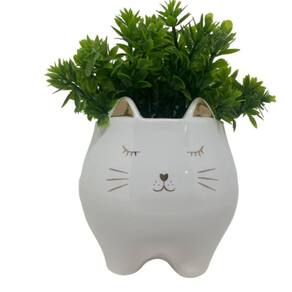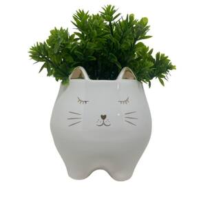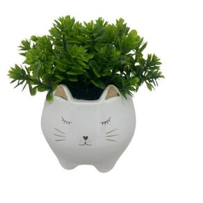 Cachepot rosto de gatinho branco de cerâmica com planta artificial.