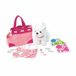 Decore e complemente a bolsa chique da sua cachorrinha diva, coleira de veludo, guia de cetim, capa de veludo, laços de cetim e etiqueta de identificação em osso de cachorro. Detalhes de feltro e strass rápidos e fáceis de remover, não são necessárias cola ou tesouras.