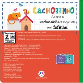 Título Do Livro: Cachorrinho Autor: Susie Brooks Idioma: Português Editora Do Livro: Ciranda Cultural Edição Do Livro: 1 Capa Do Livro: Mole Ano De Publicação: 2021 Quantidade De Páginas: 10 Altura: 14 cm Largura: 14 cm Material Da Capa Do Livro: Cartonado Com Realidade Aumentada: Não Gênero Do Livro: Infantil Subgêneros Do Livro: Animais, Cachorro, Som, Barulho, Diversão Coleção Do Livro: Som Fofinho Idade Mínima Recomendada: 0 anos Quantidade De Livros Por Kit: 1 Ilustradores: Jayne schofield Data De Publicação: 08-03-2022 Peso: 500 g