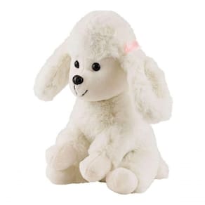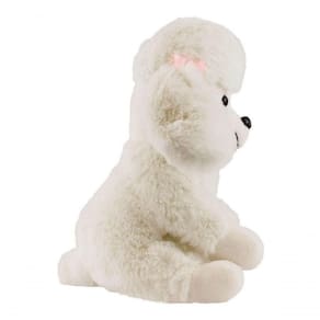 Bichinho de pelúcia no formato de um cachorro poodle sentado usando laços nas orelhas. Cachorro de pelúcia com 25 cm de altura sentado. Olhos de plástico. Material: poliéster; Enchimento: fibra de poliéster; Produto certificado por Órgão acreditado pela CGCRE do INMETRO