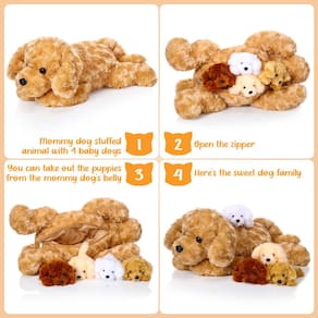 Características: Traga uma sensação adorável para os outros: Se o seu membro da família ou amigo fizer aniversário, você pode dar este pequeno filhote de pelúcia para ele ou ela e fazer com que este cachorro fofo o acompanhe para passar todos os dias felizes. Decorações engraçadas: Não só pode ser aplicado como um brinquedo, mas também como um ornamento em casa. Quando você voltar para o seu quarto e ver o adorável cachorro de pelúcia com filhotes saindo da língua para recebê-lo em casa, o que fará você se sentir aquecido. Especificações: Material: material e tecido PP Cor: como mostrado na imagem. Tamanho: Cãe-mãe: cerca de 37 x 20 x 25 cm (LWH) Cachorrinho: cerca de 10 cm de comprimento A embalagem inclui: 1 filhote de pelúcia grande. 4 filhotes pequenos de pelúcia. Observações: Medição manual, considere pequenos erros no tamanho. A cor pode existir uma pequena diferença devido a diferentes telas. Estes produtos são adequados apenas para crianças com mais de 14 anos de idade. - Você receberá: cada pacote contém 1 boneca golden retriever de pelúcia mãe e 4 pequenos golden retrievers de cores adoráveis, branco, bege, marrom escuro e marrom claro; muitas formas fofas para compartilhar com seus amigos; este conjunto de brinquedos de pelúcia para mamãe e crianças ajuda a desenvolver as habilidades sociais e a criatividade do seu filho enquanto brincam juntos - Tamanho abraçável: cada cachorrinho de pelúcia tem cerca de 37 x 20 x 25 cm/14,6 x 7,9 x 9,8 polegadas (LWH), e o cachorrinho tem cerca de 10 cm de comprimento; você pode usá-lo como travesseiro, um brinquedo macio para acompanhar você no sono e um tamanho fofo para você colocar em seus braços - Design de barriga de mamãe: barriga de cachorro com zíper, o interior pode acomodar 4 peças de cachorrinhos de pelúcia, ocupa um pequeno espaço, adequado para viagens e armazenamento, traz mais diversão para sua família e amigos - Material macio: filhotes de pelúcia fofos são feitos de materiais macios, material e tecido de veludo rosa; confortável para você tocar e seguro o suficiente, o tecido é seguro, será seu companheiro íntimo para brincar e dormir; Lembrete: devido ao transporte de compressão a vácuo, pode haver rugas em nossos animais de pelúcia quando você os receber; você pode usar um ferro para passar a ferro, não afetará seu uso normal - Uso versátil: cães de brinquedo macios são adequados para festas temáticas de animais e podem ser utilizados como presentes, como Páscoa, Dia dos Namorados, Halloween, Natal, Dia das Crianças, Dia das Mães, Dia de Ação de Graças e assim por diante; pessoas que gostam de bichos de pelúcia vão adorar esses filhotes fofos
