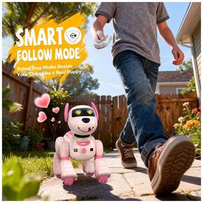 O cachorro robô Anysun rosa é um pet eletrônico programável com controle remoto, indicado para crianças a partir de 8 anos, que combina três modos de interação: controle remoto, comandos de voz em inglês e sensores de toque no corpo. O brinquedo aceita comandos direcionais e aciona reações “fofas” ao toque, simulando respostas de um cão de estimação em ambiente interno.