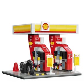 R: O kit Blocos de Montar Posto de Gasolina Shell Mini contém 305 peças para montagem detalhada.