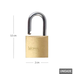 Cadeado 20mm com 2 Chaves Haste Curta Bronze Mantenha seus pertences seguros com praticidade e eficiência com o Cadeado Latão de 20mm com Haste Curta, acompanhado de 2 chaves. Compacto e resistente, é a escolha ideal para aplicações que exigem segurança em espaços reduzidos, sem abrir mão de durabilidade e design discreto.\nA haste curta garante mais resistência a tentativas de arrombamento, sendo perfeita para uso em zíperes de mochilas, maletas, armários, gavetas, pequenos portões, estojos e caixas de ferramentas.\nEspecificações: Marca : MONALIZA\nTipo de material : Aço Inox, Latão\nCores ou Estampa : Dourado\nDimensões do Produto : 3,5 X 2 X 1 CM\nDimensões da Embalagem : 12 X 7,5 X 1 CM\nPeso Bruto (Gramas) : 0.037
