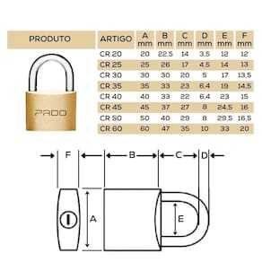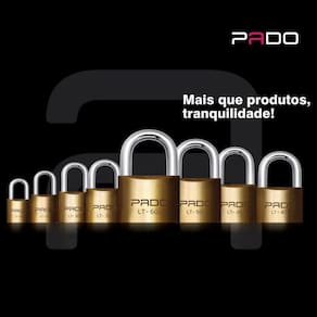 Características do cadeado latão com 2 chaves pado: Material: latão, aço inox e aço carbono. Utilizar apenas óleo mineral. Tamanhos: 20mm, 25mm, 30mm, 35mm e 40mm.