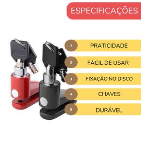 Especificações: * Unidades Disponíveis: 1 unidade * Cores Disponíveis: Verifique as opções e informe a cor desejada ao fazer o pedido. * Praticidade: Fácil de usar, basta fixar no disco de freio. * Acompanha: 2 chaves para maior comodidade.