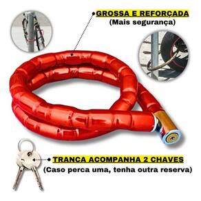 Cadeado indicado para motocicletas e bicicletas com 100 cm de perímetro, corpo flexível composto de anéis de aço articulados com espessura 22 mm. Revestimento emborrachado e fechadura em metal zincado. Indicado para amarração antifurto de motocicletas e bicicletas.