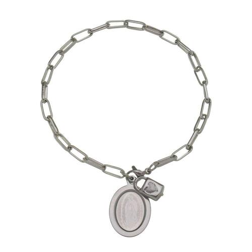 A pulseira contém um cadeado e uma medalha gravada a laser com a imagem de Nossa Senhora de Guadalupe. Um fecho prata é utilizado para fechar o acessório e ajustá-lo ao pulso.